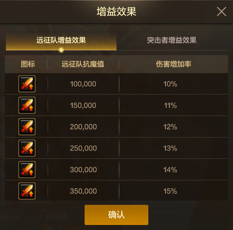 远征队增益效果将根据勇士远征中所有角色的总魔抗值获得。