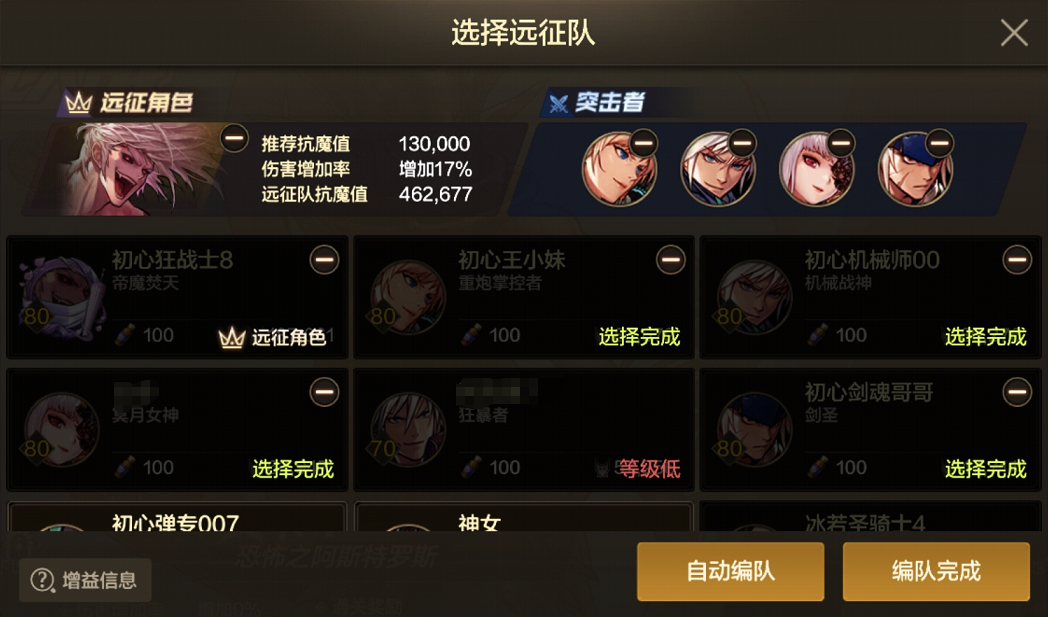 挑战时,战士只需固定一名“远征角色”(主角),并带上最多4位“突击者”的辅助战斗力。