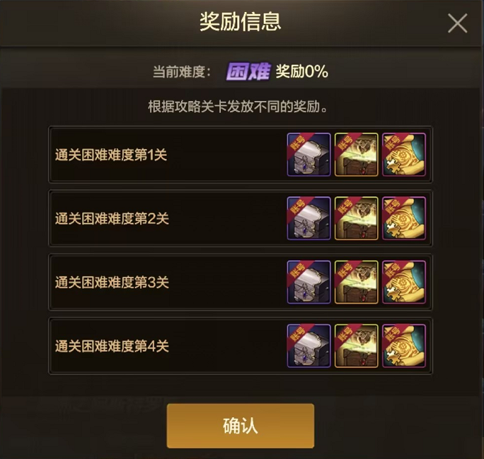 进入时,可以选择3个难度:简单/普通/困难。难度越高,获得的奖励就越丰厚。难度困难时,系统会在每周初始化时根据总游戏时长进行排名。