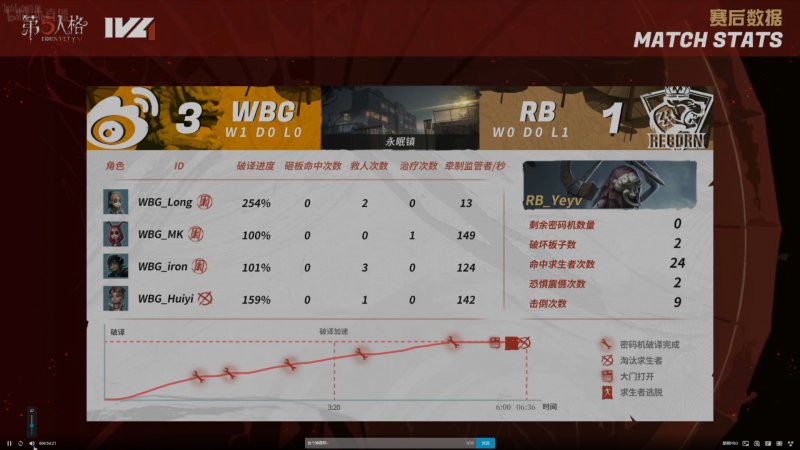 RB的求生者选择了杂技演员、佣兵、“小女孩”、邮差(BAN梦之女巫);WBG的监管者Ymm选择了渔女。(BAN祭司、昆虫学者、前锋、先知)