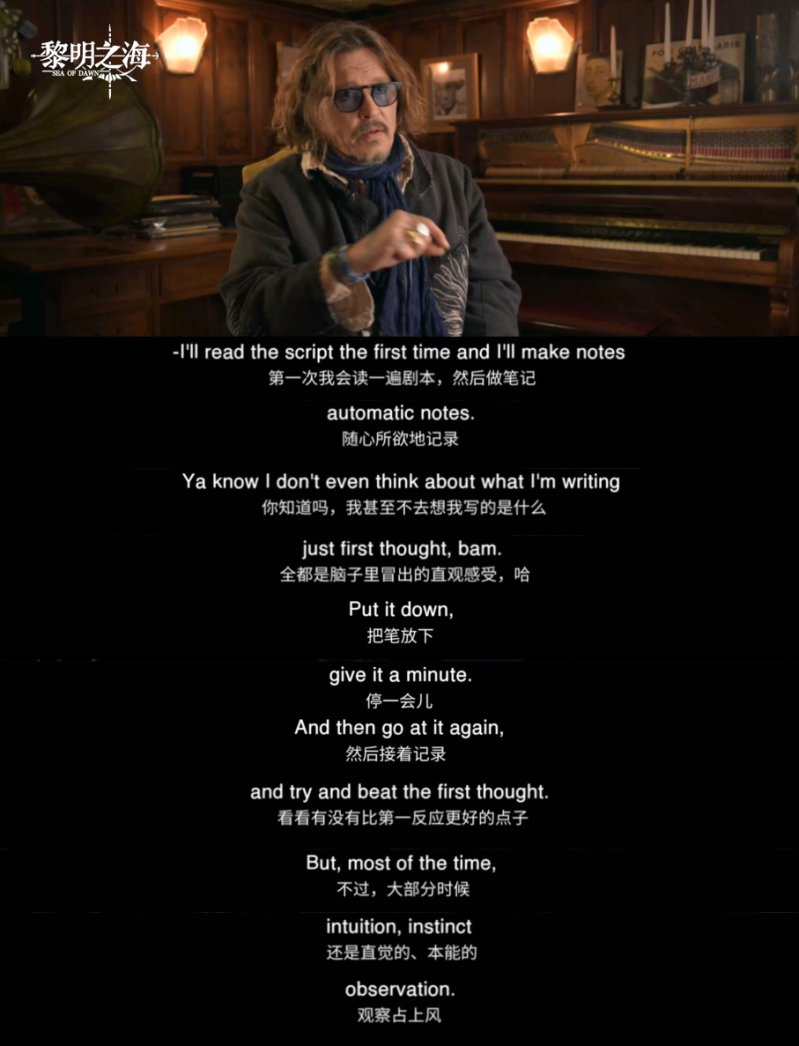 作为好莱坞的天才演员,约翰尼德普在拍摄时有一些独特的习惯。在采访中,德普提到,他在阅读剧本时习惯凭直觉自由记录,在沉默中观察和倾听剧本中人物的内心世界。依靠直觉的指引,德普能够更深刻地理解角色并与之融合。