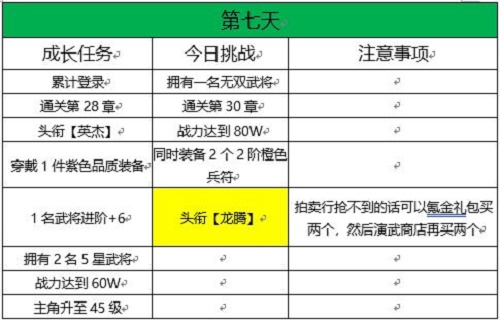 6:前七天尽量均衡发展,七天后再去极限,以利于完成任务(高级武将和装备质量)