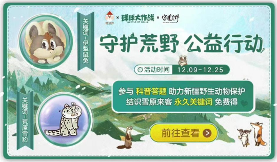 此外,《球球大作战》在游戏中打造了以伊犁鼠兔为核心的野生动物知识科普互动平台,从物种特征、生活习性、生态保护等方面进行科普,玩家参与答题活动便会为公益行动献上一份爱心,最终由《球球大作战》向中国志愿服务基金会发起定向捐助。