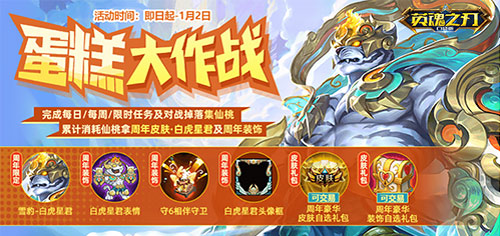 2022年12月9日-2023年1月2日,6周年专属福利活动如火如荼,蛋糕大战打响!完成日常登录、为游戏点赞、为游戏组队等任务获得仙桃道具,累计消费仙桃,并收集白虎邢俊皮礼包、白虎邢俊头架、Shou6随行护卫皮、郭毅风华幸运券等精美礼品!