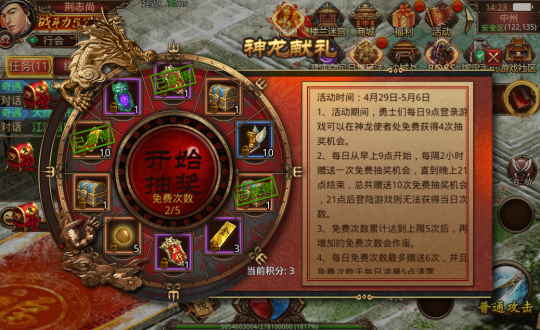 新服开启前7天,每日9点登录游戏即可在【神龙使者】处免费获得4次抽奖机会,随后,每隔2小时再赠送一次,总共赠送10次免费抽奖机会,各种珍稀道具、通宝,更有180天限时高属性称号!