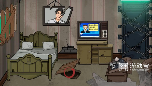 1、室内:(左往右)封住的窗户,撕裂的照片,电视失踪新闻,录像带,锁住的门,之后会出现地下室入口。