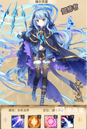 2、梅尔克里,职业水系法师上阵该英雄后有减攻、紧固等效果,该英雄有4个技能,2个被动技能和2个主动技能,等级达到100级后均可激活所有技能。