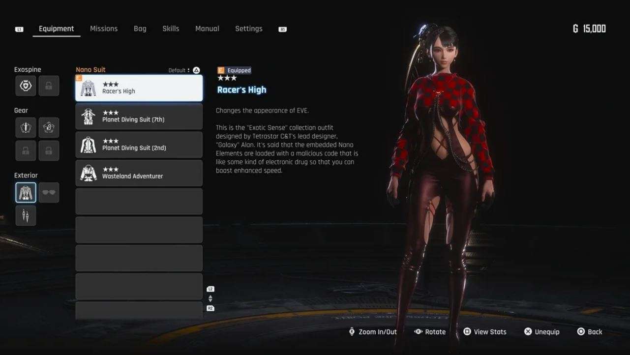根据服装描述,这是由Tetrastar C&T的首席设计师“银河”艾伦设计的“异域风情”系列的一部分。据说嵌入式纳米元素中载有恶意代码,类似于某种电子药物,可以提升速度。