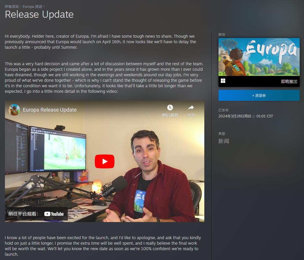 3月28日,吉卜力风冒险游戏《Europa》宣布将延期至2024年夏季发售,详细的发售日期将在之后公布。该作原定于4月16日发售,首先登陆PC,随后推出主机版,官方给出延期理由是游戏未能达到理想状态。