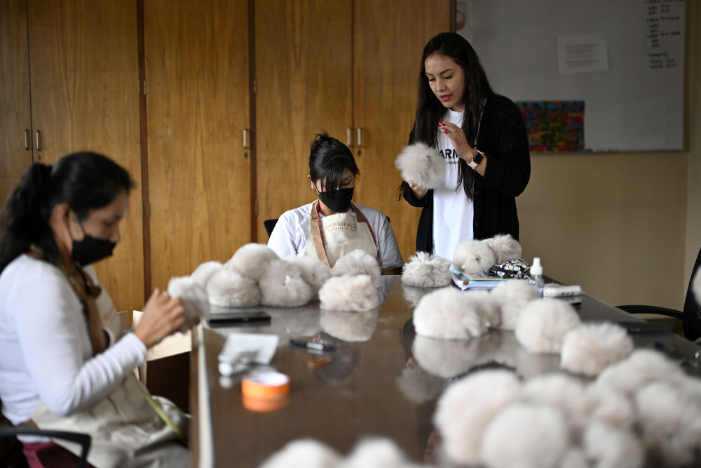 6月20日,在秘鲁阿雷基帕,马马尼与中方合作品牌的秘鲁合伙人亚历杭德拉·贝德雷加尔(右一)检查羊驼玩偶。新华社记者李木子摄