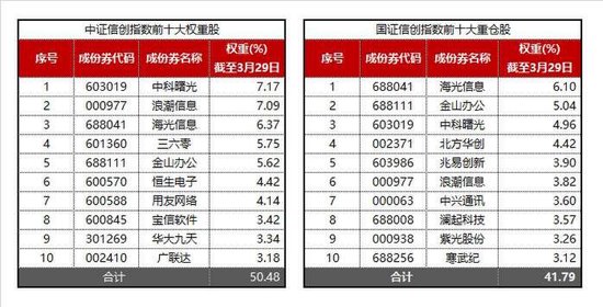 中证信创指数前十大权重股占比50.48%,占比已超半数,而国证信创指数前十大权重股占比为41.79%。