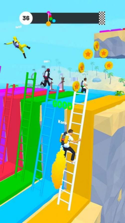 爬梯我最6是一款跑酷类型的休闲游戏。游戏中会有不同的跑道。如果选择跑道,也可以由系统随机分配。跑道的形状不断向上延伸。你要借助梯子爬上去,谁先到达终点谁就是胜利者。