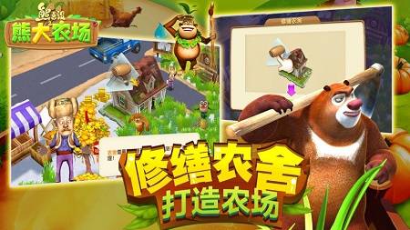 经典人物再现,光头强经营农场,美食帮手熊达。他们可以在自己的农场里种植农作物、水果、饲养可爱的宠物,还可以扩大农场来完成交易。