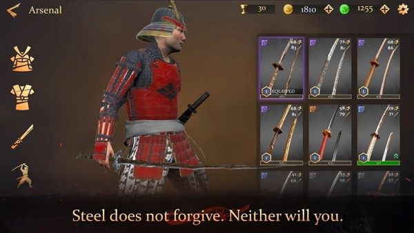 1、收集并解锁威力强大的武士刀和传奇宝剑。升级武器,还可以提升伤害和速度。