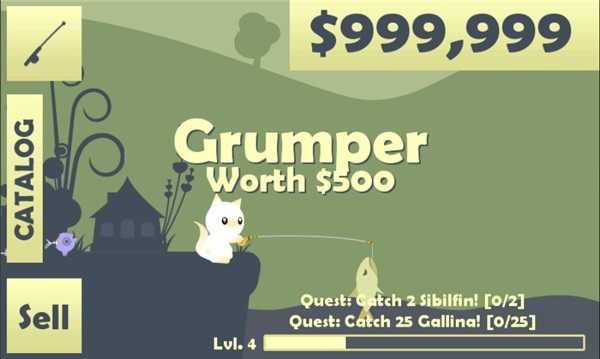 2、钓到鱼后,长按手机屏幕,就可以把鱼钓上来,点击左下角的【sell】出售可获得金币;