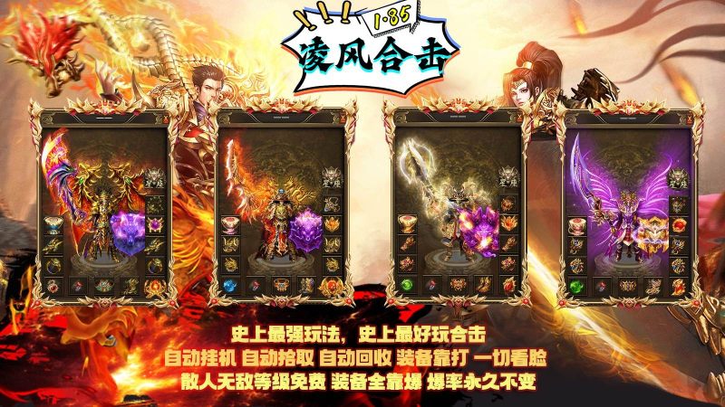 凌风合击是一款185三职业合击传奇手游,在凌风合击中,上线就有自动挂机、自动捡物、自动回收,游戏爆率全开,装备都靠打,散人无敌等级免费,超级BOSS爆一切,低消费散人服,装备保值长久稳定