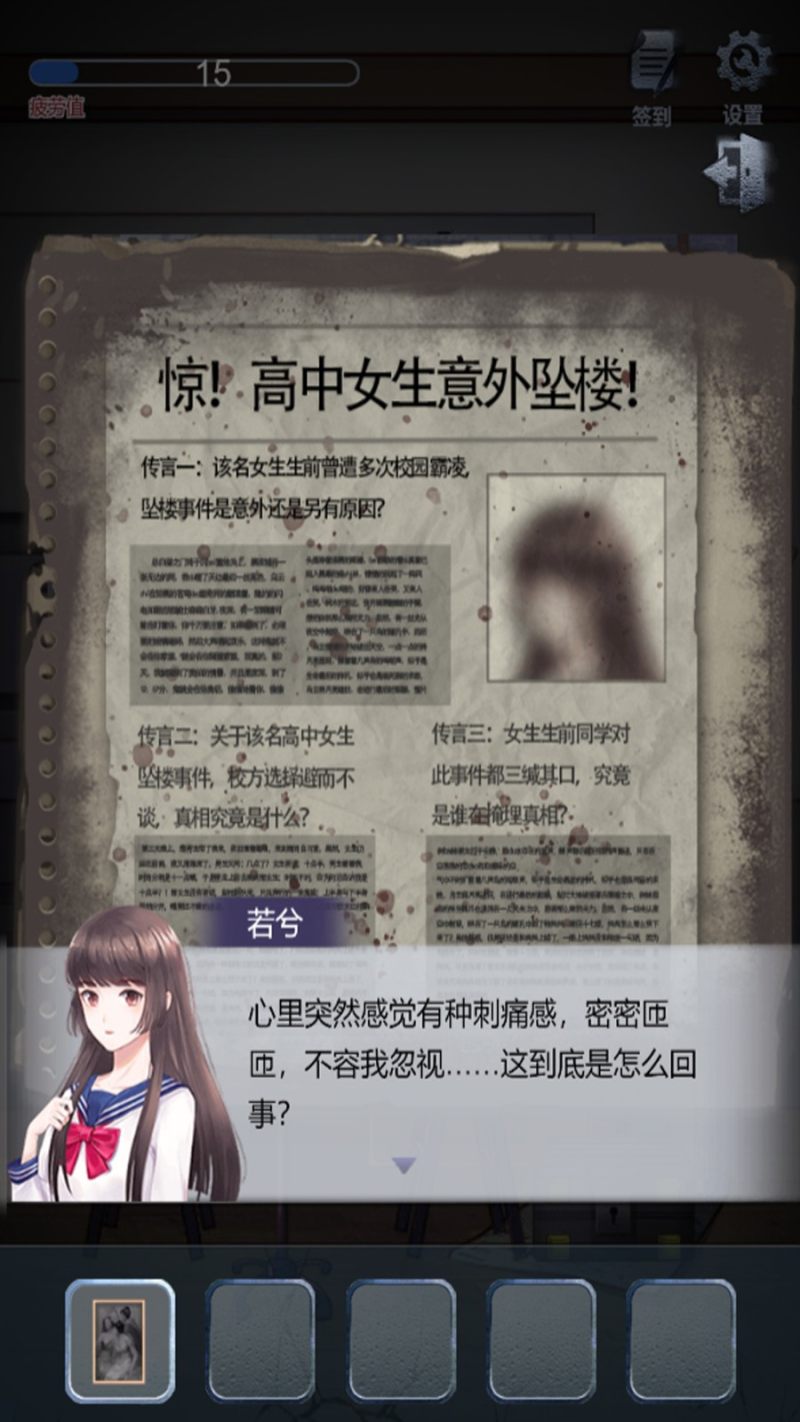1.这是一个恐怖剧情解谜游戏,以多年前教学楼跳楼自杀的女生为剧情故事展开的解谜游戏。