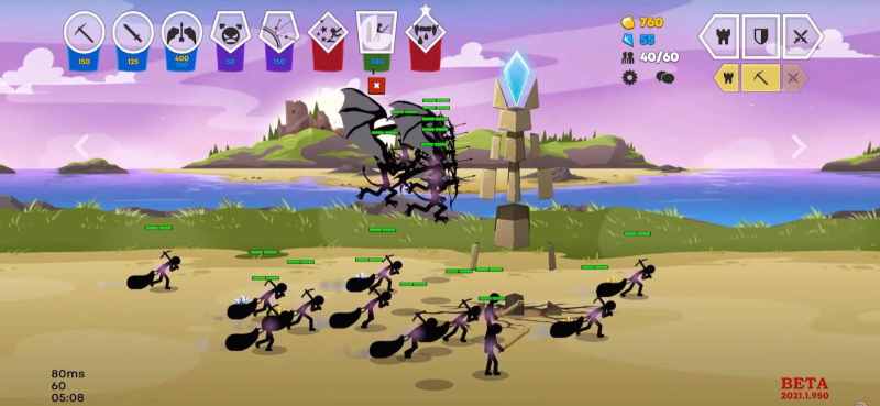 2.玩家可以控制每个火柴人,开采黄金,对现在有的兵种排兵布阵,毁坏敌人阵营的雕像。