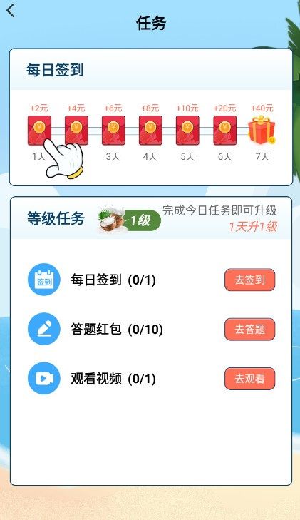 2.升级任务也比较简单,只需要完成每日的签到、答题以及视频观看就能获得任务红包。