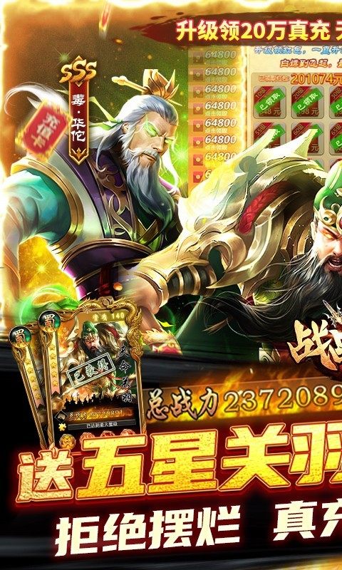 战吕布送五星关羽20万充是一款三国策略卡牌手游,在战吕布送五星关羽20万充,玩家上线即送五星神将关羽,还能无限瓜分十亿元宝,真福利无套路,升级还能领取20万红包,可以激活线下永久累充活动,轻松实现财富自由。