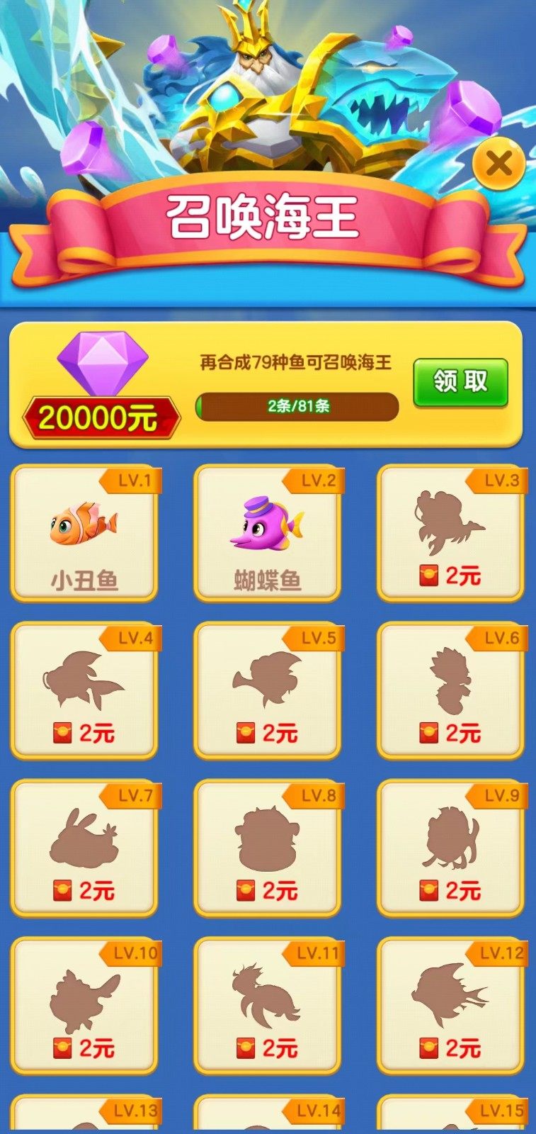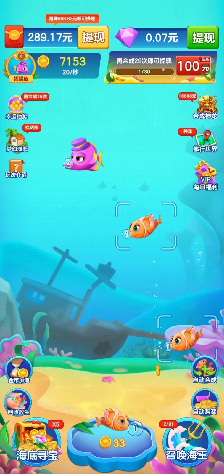 1.通过合成相同等级的小鱼就可以获得红包奖励,解锁新品种就有红包奖