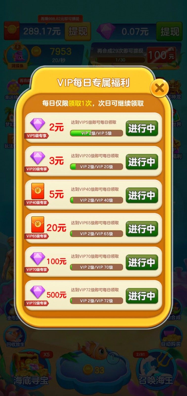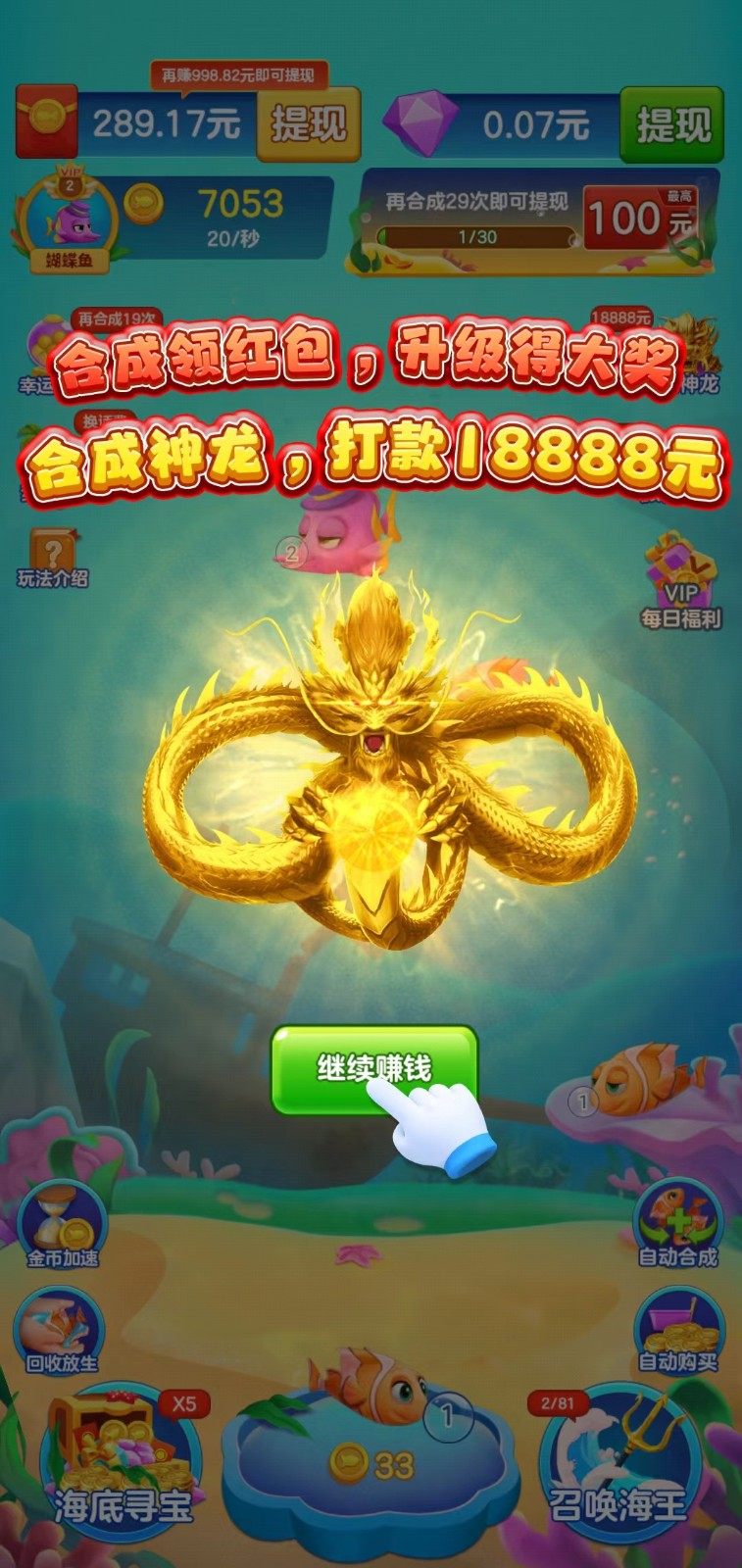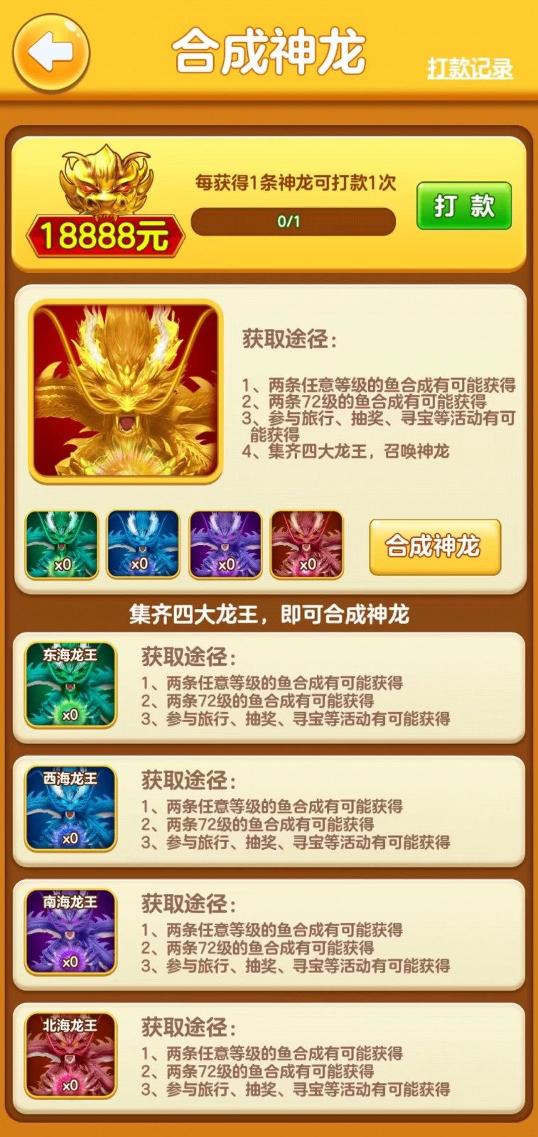 2.通过参与活动和完成合成有机会获得龙王,龙王可以合成神龙获得巨额打款