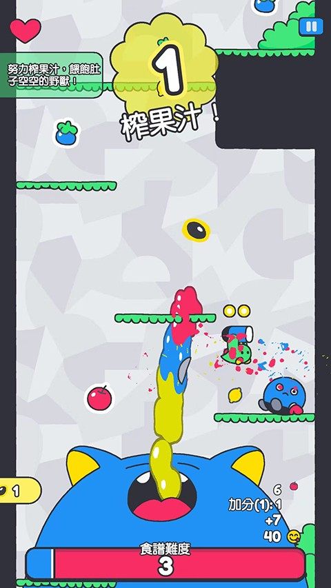 2.收集途中的苹果、柠檬、樱桃等各种各样的水果,按照野兽所要求的水果食谱榨出果汁,投喂这只饥饿的蓝色怪兽