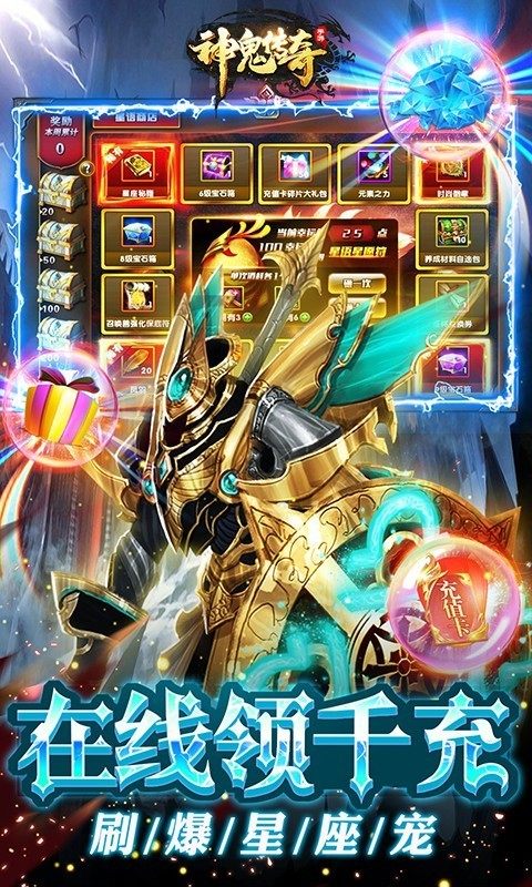 神鬼传奇怒刷百亿钻,神魔奇幻风采角色扮演类的游戏,每天都可以领千充,在线刷爆星座宠,神鬼传奇游戏天天领补给,资源无限送、3D仙魔主题的手游来袭,在历史化的魔幻战场上pk,任何坐骑都可以收集,自由华丽的pk,挑选出合适的职业来战斗。