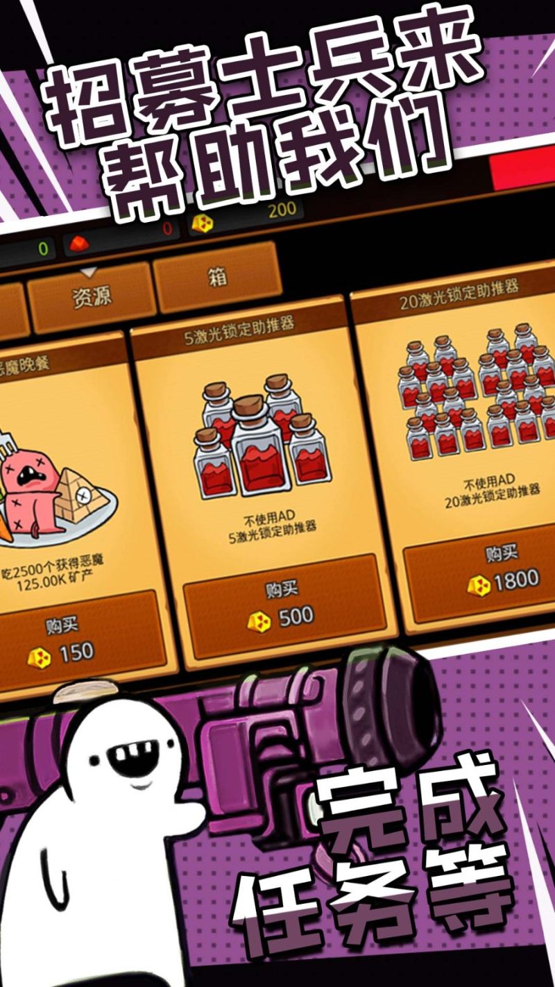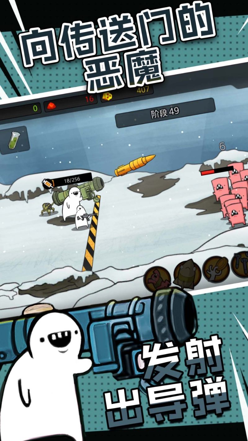 还可解锁更多的士兵和武器为你战斗,大大提升玩家的战斗力,把玩家解锁的所有士兵和武器全部拖进战场,加强玩家的火力这样你就可以看见敌人的血量快速消失了。