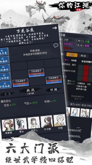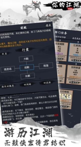 你的江湖是一款新的文字玩法的武侠冒险闯关游戏,你的江湖游戏为大家带来了全新的挑战任务和战斗模式,每一个职业角色为大家带来的内容也是不一样的,全新文字技术打造出来的游戏配上精彩的故事剧情,让许多玩家可以感受全新的游戏体验。