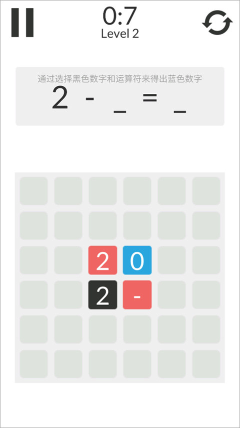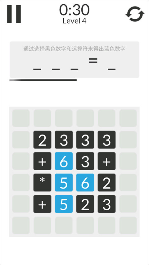 4、点击选择黑色数字和运算符形成计算式,当计算式的结果等于蓝色数字时,可进入下一关