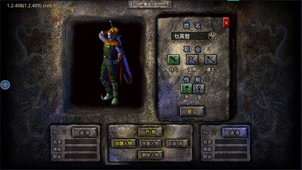 首次进入就是角色创建界面,随机选择或输入昵称。当昵称符合规范且未被他人注册时,才可以使用。可以选择职业和性别,点击“提交”开始游戏: