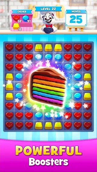 游戏完美遵循经典的三消规则,通过将两个连在一起的饼干互换位置以达成消除,期间只有三个或三个以上的串联饼干才能消除,且数量越多所获得积分也就越多,而且消除后所遗留的糕点还能在后期为你带来更多的积分效益。