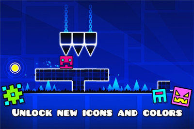 几何冲刺是一款小小方块在不同险境中穿梭冒险的休闲闯关游戏。这是一个由几何组成的世界,小小的方块在玩家的操控下穿梭各种阻碍中,有从天而降尖刺和火焰、毒液威胁你。