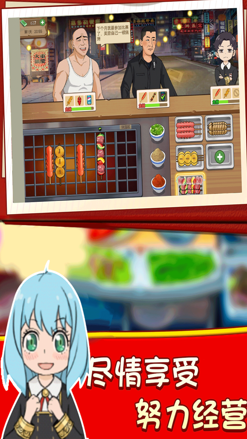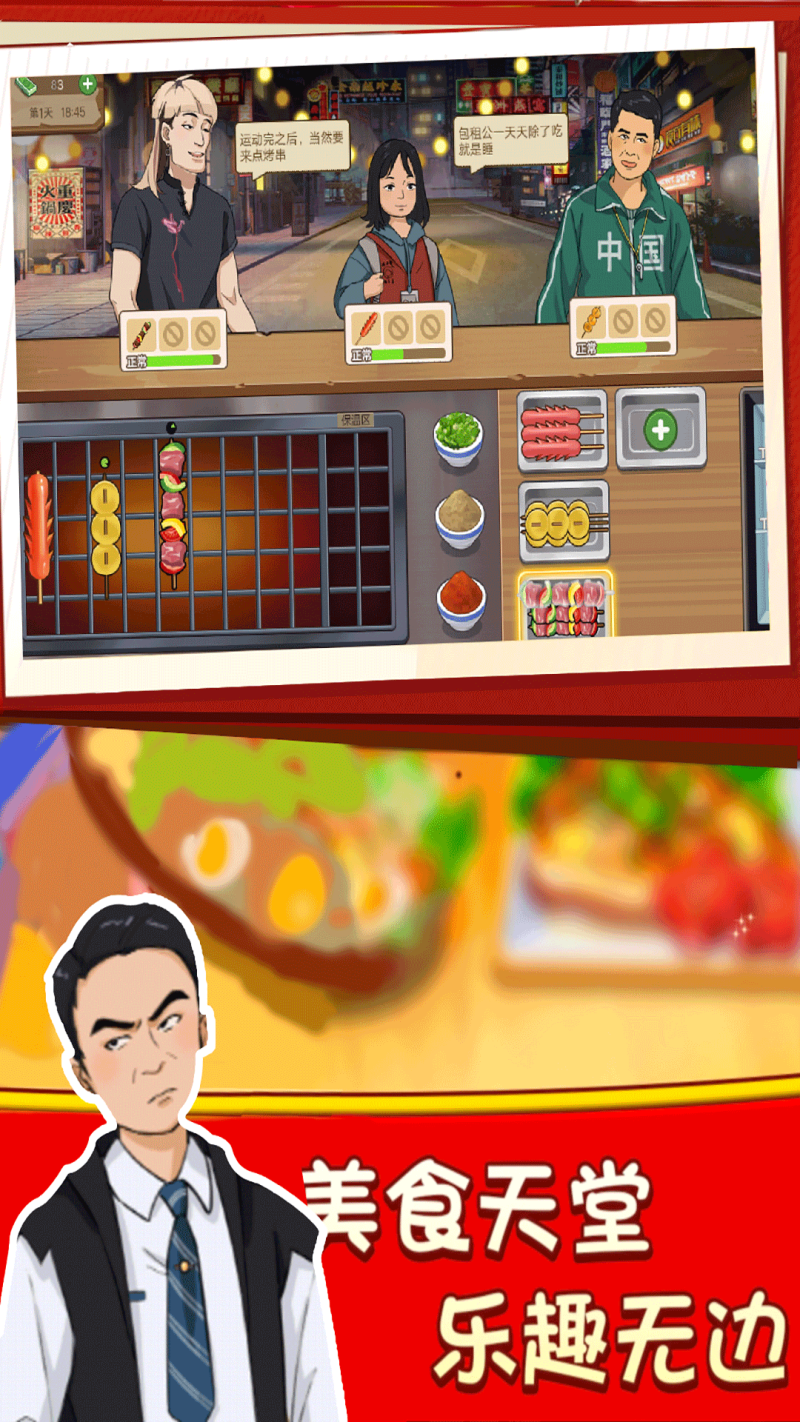 1.玩家将学会制作烧烤,根据顾客的要求,制作相应的美食,并且赚取金币。