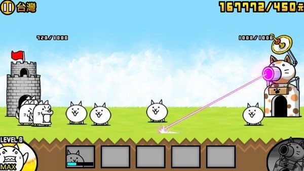 然后进入第四关,先将金钱上限升级为二级,然后召唤14个大男子主义猫开始进攻,注意敌军有了一个全新的兵种,是一种类人生物,如果抵挡不住了可以使用猫炮进行攻击,基本上过关就没有悬念了。