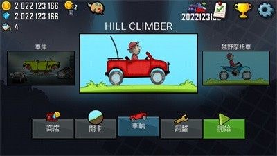 1.从初始的Hill Climber(吉普)开始,可解锁摩托车、怪物卡车、拖拉机、嬉皮面包车、独轮车等数十种风格各异的车辆。