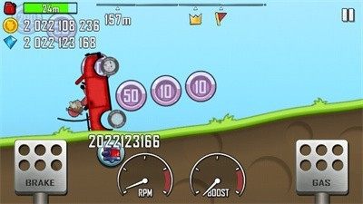 3.路上散落金币和燃料罐,边跑边捡,合理分配燃料是跑远距离的关键。翻车或耗尽燃料即结束一轮,刺激玩家不断尝试优化路线。