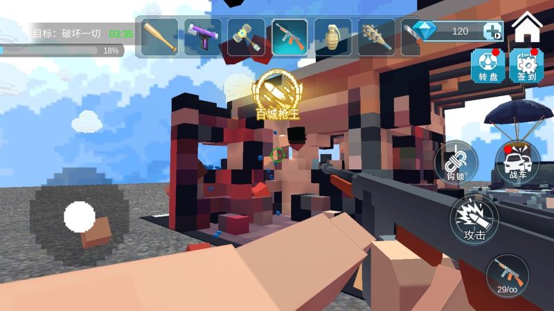 2.每天上线签到可以领取道具和武器,还有转盘抽奖可以获得限定武器和工具。