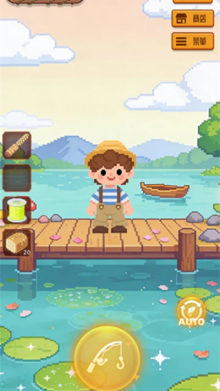 点击屏幕中央的【钓鱼】按钮即可抛竿。右侧可快速打开鱼护、背包、商店和菜单,左侧为道具栏,右下角的【AUTO】按钮可开启自动钓鱼,底部为升级进度条。