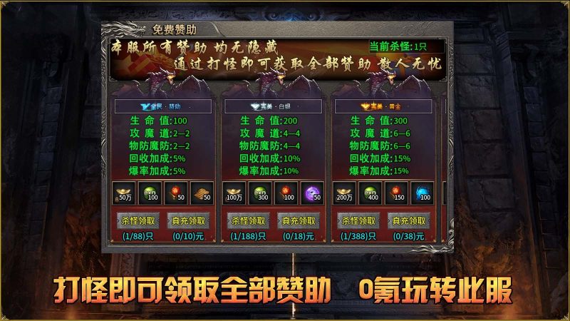 3.精准蹲点赤月恶魔或祖玛教主,靠着合击技快速抢杀,装备掉落实时自动入包并回收成货币。