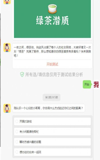 你有绿茶的潜质吗测试测试游戏是一种带有多种模拟体验的测试游戏。要知道绿茶可能是很多人非常讨厌的角色。所以这个测试游戏给玩家提供了一个测试的机会,通过一些非常恰当的问题来测试自己是否有绿茶的潜质,准确率也非常高。