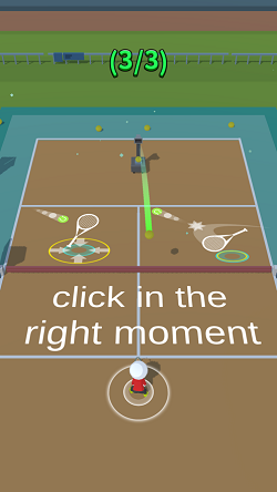 简单的网球游戏,玩家只需要注意光圈,找准时机点击屏幕,抓住时机准确回球。回报越准确,伤害越高。