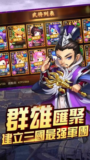 《三国萌神记》是一款基于三国故事的冒险格斗游戏。q,游戏里的三国将军,已经萌化了。可以招募他们,匹配自己最适合战斗的阵容,建立自己的战斗系统,升级强化自己的士兵,成为无敌的军队。